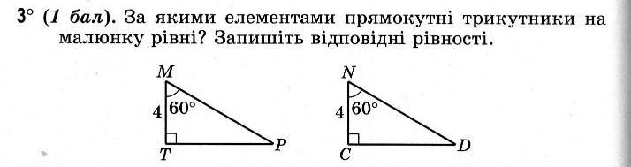 3° (1 бал). За якими елементами прямокутні трикутники на малюнку рiвнi? Запишіть відповідні рівності.