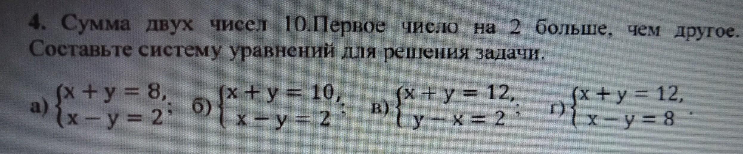 Сумма двух чисел 10 первое число на два раза больше чем другое. Составьте систему уравнений для решения задачи.