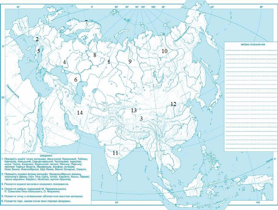Які географічні об'єкти (гори, рівнини) позначені на контурній карті цифрами.
