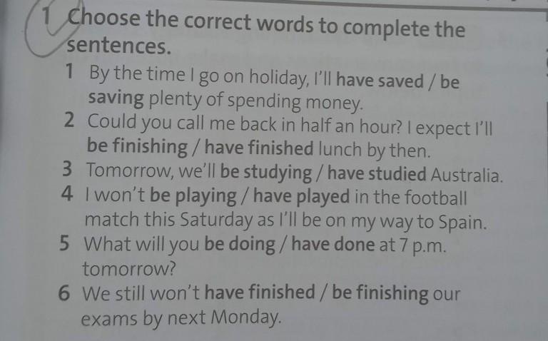 Choose the correct words to complete the sentences. 1 By the time I go on holiday, I'll have saved / be saving plenty of spending money. 2 Could you call me back in half an hour? I expect I' be finishing/have finished lunch by then. 3 Tomorrow, we'll be studying/have studied Austral 4 I won't be playing / have played in the football 5 match this Saturday as I'll be on my way to Spain. What will you be doing/have done at 7 p.m. tomorrow? 6 We still won't have finished / be finishing our exams by next Monday.