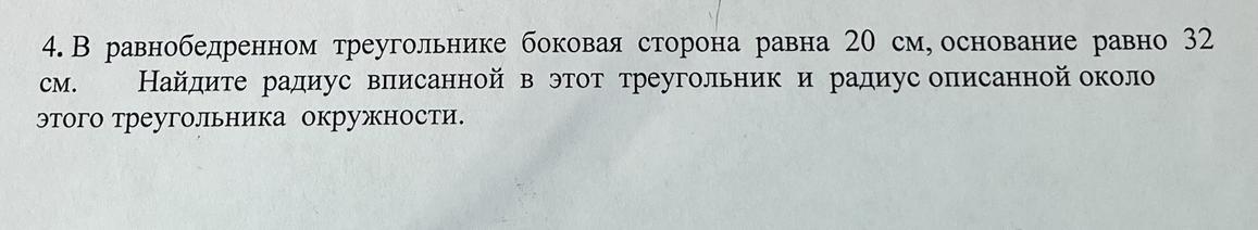 В равнобедренном треугольнике боковая сторона равна 20 см, основание равно 32 см.Найдите радиус вписанной и радиус описанной около этого треугольника окружности.