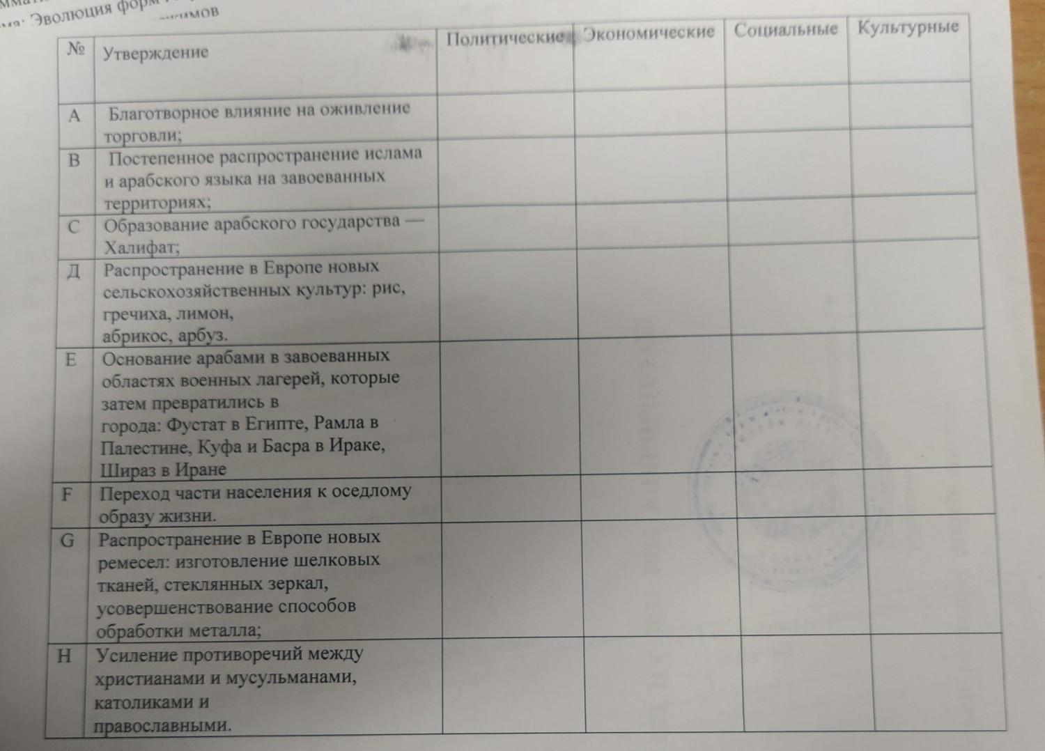 Распределите утверждения о последствиях арабских завоеваний и Крестовых походов по сферам жизни общества. Вставьте литеры предложенных утверждений в соответствующую графу таблицы. No Утверждение Политические Экономические Социальные культурные G A Благотворное влияние на оживление торговли; Постепенное распространение ислама и арабского языка на завоеванных территориях: Образование арабского государства Халифат; В затем превратились в города: фустат в Египте, Рамла в Палестине, Куфа и Басра в Ираке, Шираз в Иране Переход части населения к оседлому образу жизни. Распространение в Европе новых ремесел: изготовление шелковых тканей, стеклянных зеркал, усовершенствование способов обработки металла; Усиление противоречий между христианами и мусульманами, католиками и православными.