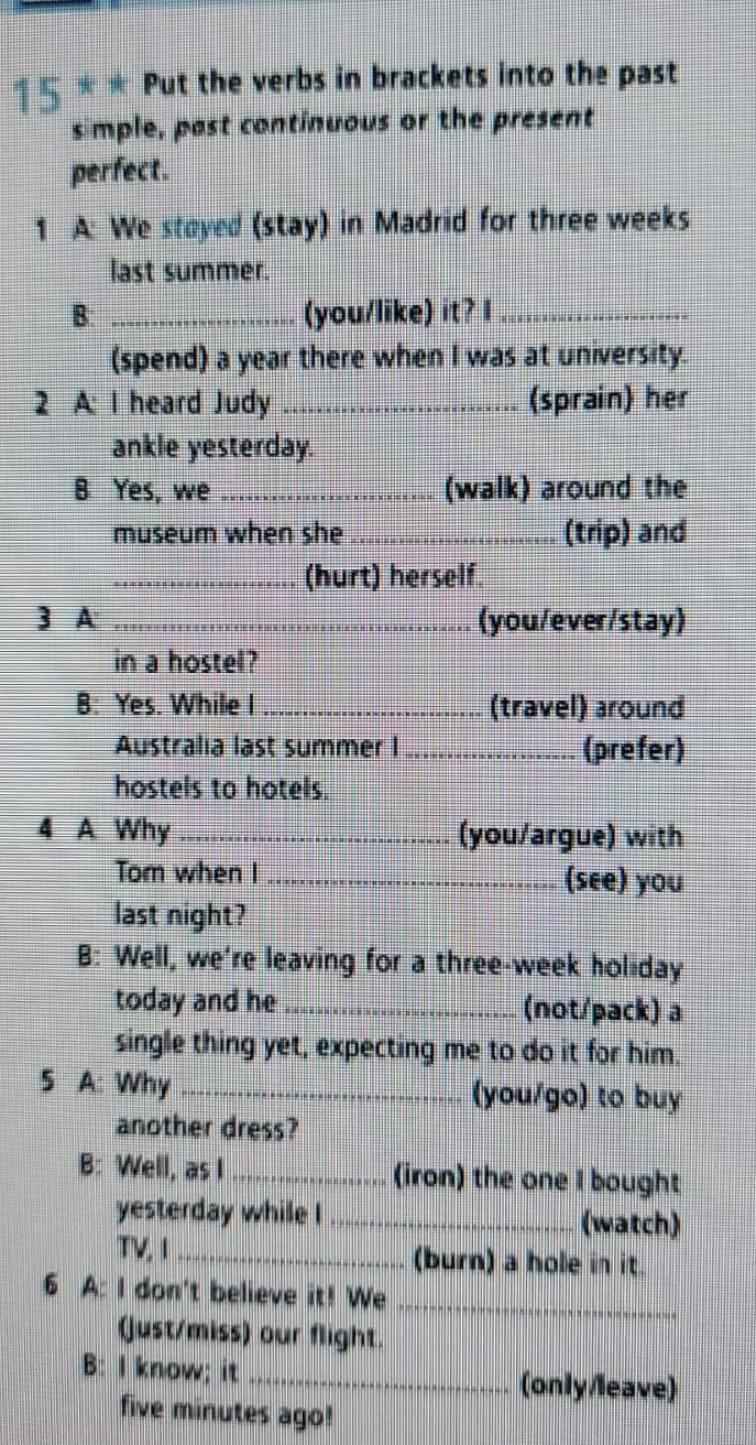 15 ** Put the verbs in brackets into the past simple, past continuous or the present 1 A We stayed (stay) in Madrid for three weeks last summer. 8 (you/like) it? I (spend) a year there when I was at university. (sprain) her 2 A I heard Judy ankle yesterday. 8 Yes, we museum when she ********* in a hostel? 8. Yes. While | 4 A Why Australia last summer 1 hostels to hotels. 5 A: Why another dress? B: Well, as I (hurt) herself. yesterday while I TV, I 6 A: I don't believe it! We BER (just/miss) our flight. B: I know it Tom when I last night? B: Well, we're leaving for a three-week holiday today and he (not/pack) a single thing yet, expecting me to do it for him. (you/go) to buy (walk) around the (trip) and five minutes ago! E (you/ever/stay) (travel) around (prefer) (you/argue) with (see) you (iron) the one I bought (watch) (burn) a hole in it. (only/leave)