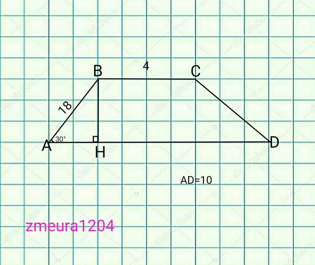 в трапеции с основаниями 4см, 10 и боковой стороной равной 18 см, угол между боковой стороной и большим основанием равна 30°. Найдите площадь этой трапеции