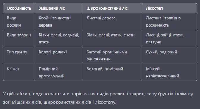 Складіть порівняльну характеристику (у формі таблиці) пристосування рослин до умов навколишнього середовища в ме- жах зон мішаних лісів і степу.