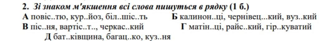 2. Зі знаком м'якшення всі слова пишуться в рядку (1 б.) А повіс..тю, кур..йоз, бiл..ш.с..ть В піс..ня, вартіс..т.., черкас..кий Д бат..ківщина, багац..ко, куз..ня Б калинон..ці, чернівец...кий, вуз..кий Г матін..ці, райс..кий, гір..куватий