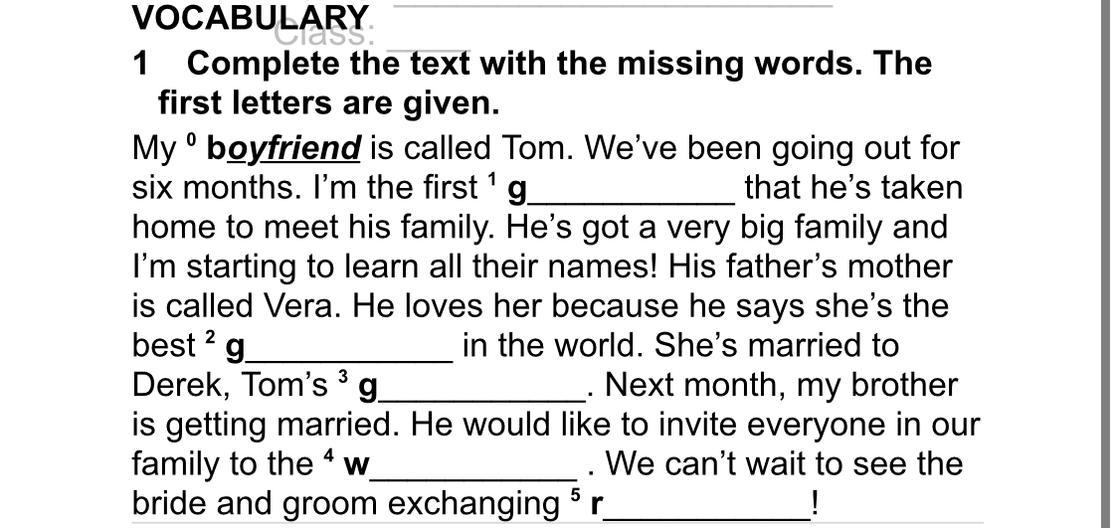 My boyfriend is called Tom. We've been going out for six months. I'm the first girl that he's taken home to meet his family. He's got a very big family and I'm starting to learn all their names! His father's mother is called Vera. He loves her because he says she's the best grandma in the world. She's married to Derek, Tom's grandpa. Next month, my brother is getting married. He would like to invite everyone in our family to the wedding. We can't wait to see the bride and groom exchanging vows.
