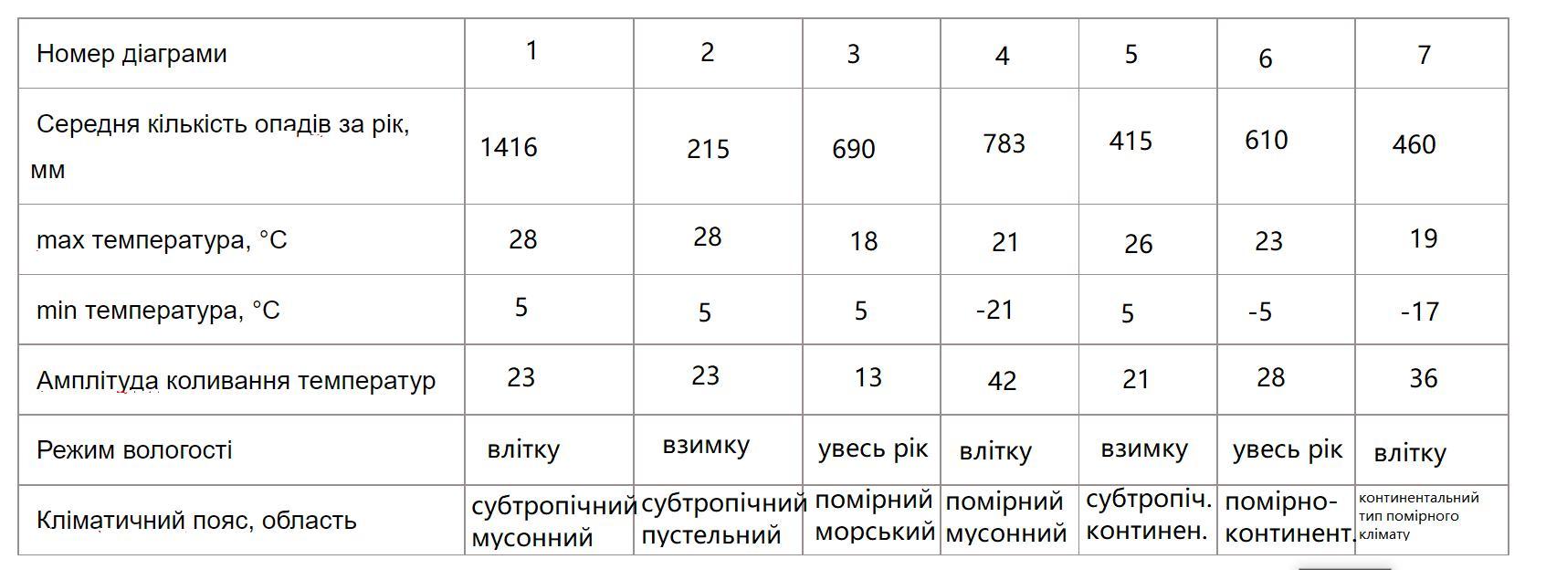 - Таблиця з характеристиками і типами клімату дана нижче у додатку