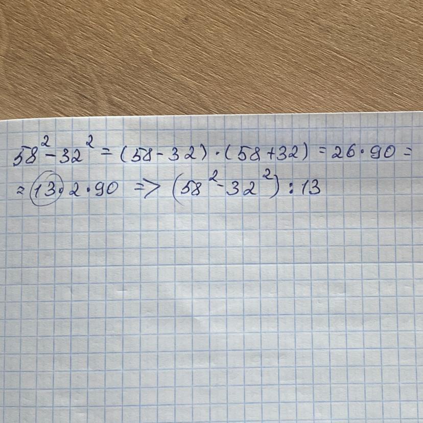 Если оба выражения с квадратами, то применяется ФСУ (формула сокращенного умножения) разность квадратов. Она раскладывается на произведение разности этих выражений на их сумму. Далее оказывается, что один из множителей (26) состоит из множителей (13 и 2). Делаем вывод: если в выражении есть множитель 13, то оно делится на 13, поэтому (58^2-32^2):13