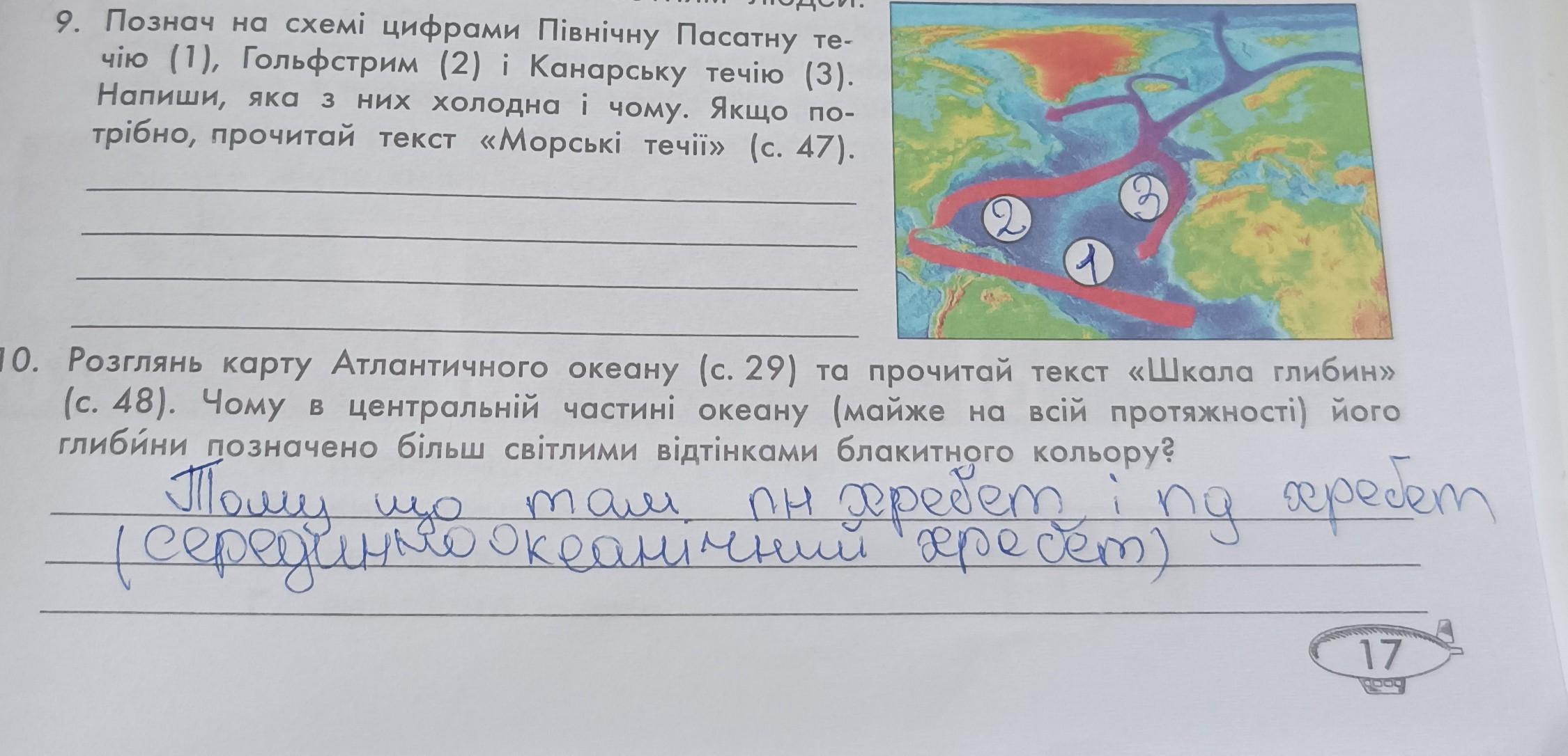 будь-ласка,,допомооожіть9. Познач на схемі цифрами Північну Пасатну те- чiю (1), Гольфстрим (2) i Канарську течію (3). Напиши, яка з них холодна і чому. Якщо по- трiбно, прочитай текст «Морські течії» (с. 47). S 10. Розглянь карту Атлантичного океану (с. 29) та прочитай текст «Шкала глибин» (с. 48). Чому в центральній частині океану (майже на всій протяжності) його глибини позначено більш світлими відтінками блакитного кольору,