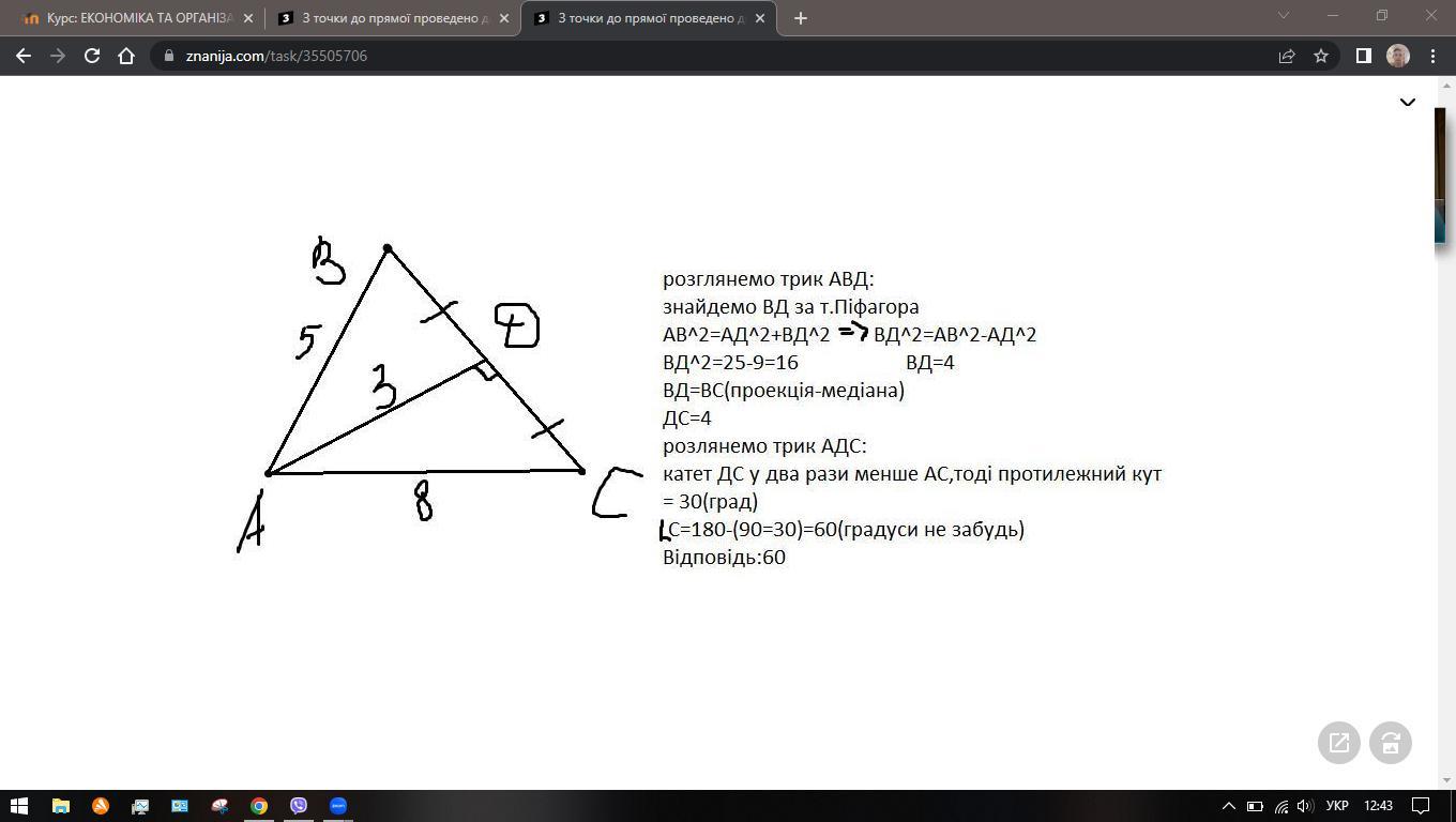 З точки до прямої проведено дві похилізавдовжки 5 см і 8 см. Який кут утворює друга похила з прямою, якщо проєкція першої похилої на пряму дорівнює 3 см ?