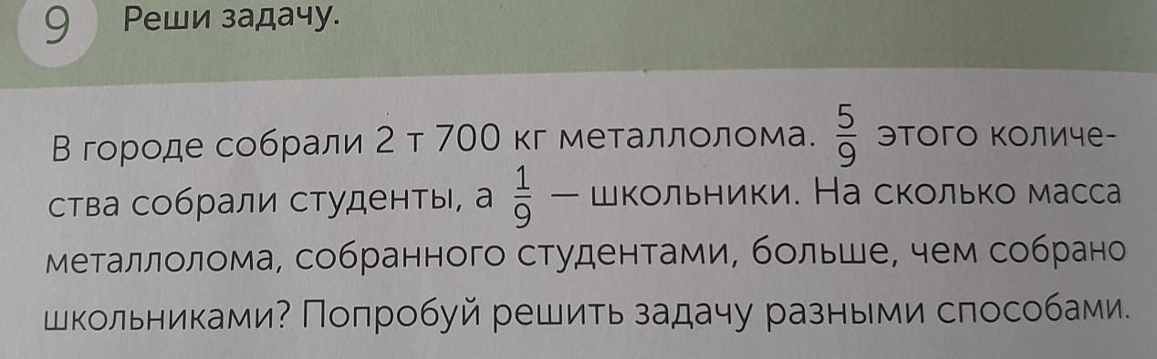 9 Реши задачу. В городе собрали 2 т 700 кг металлолома. этого количе- - ства собрали студенты, а з школьники. На сколько масса металлолома, собранного студентами, больше, чем собрано школьниками? Попробуй решить задачу разными способами.