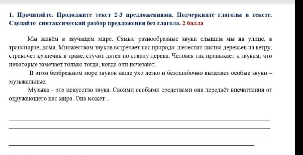 1. Прочитайте. Продолжите текст 2-3 предложениями. Подчеркните глаголы в тексте. Сделайте синтаксический разбор предложения без глагола.
