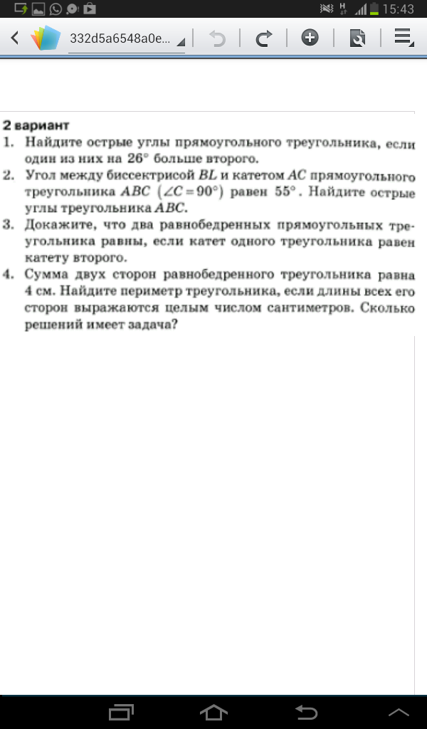1. Пусть x и y - искомые углы. Известно, что сумма острых углов прямоугольного треугольника равна 90 градусам, то есть x+y=90. Из условия следует, что x=y+26. Подставив в первое уравнение, получим y+26+y=90 ⇒ 2y=90-26 ⇒ 2y=64 ⇒ y=32, x=58. Значит, углы равны 58 и 32 градусам.