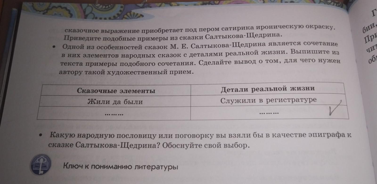 ● сказочное выражение приобретает под пером сатирика ироническую окраску. Приведите подобные примеры из сказки Салтыкова-Щедрина. Одной из особенностей сказок М. Е. Салтыкова-Щедрина является сочетание в них элементов народных сказок с деталями реальной жизни. Выпишите из текста примеры подобного сочетания. Сделайте вывод о том, для чего нужен автору такой художественный прием. Сказочные элементы Жили да были ......... Детали реальной жизни Служили в регистратуре • Какую народную пословицу или поговорку вы взяли бы в качестве эпиграфа к сказке Салтыкова-Щедрина, Обоснуйте свой выбор.