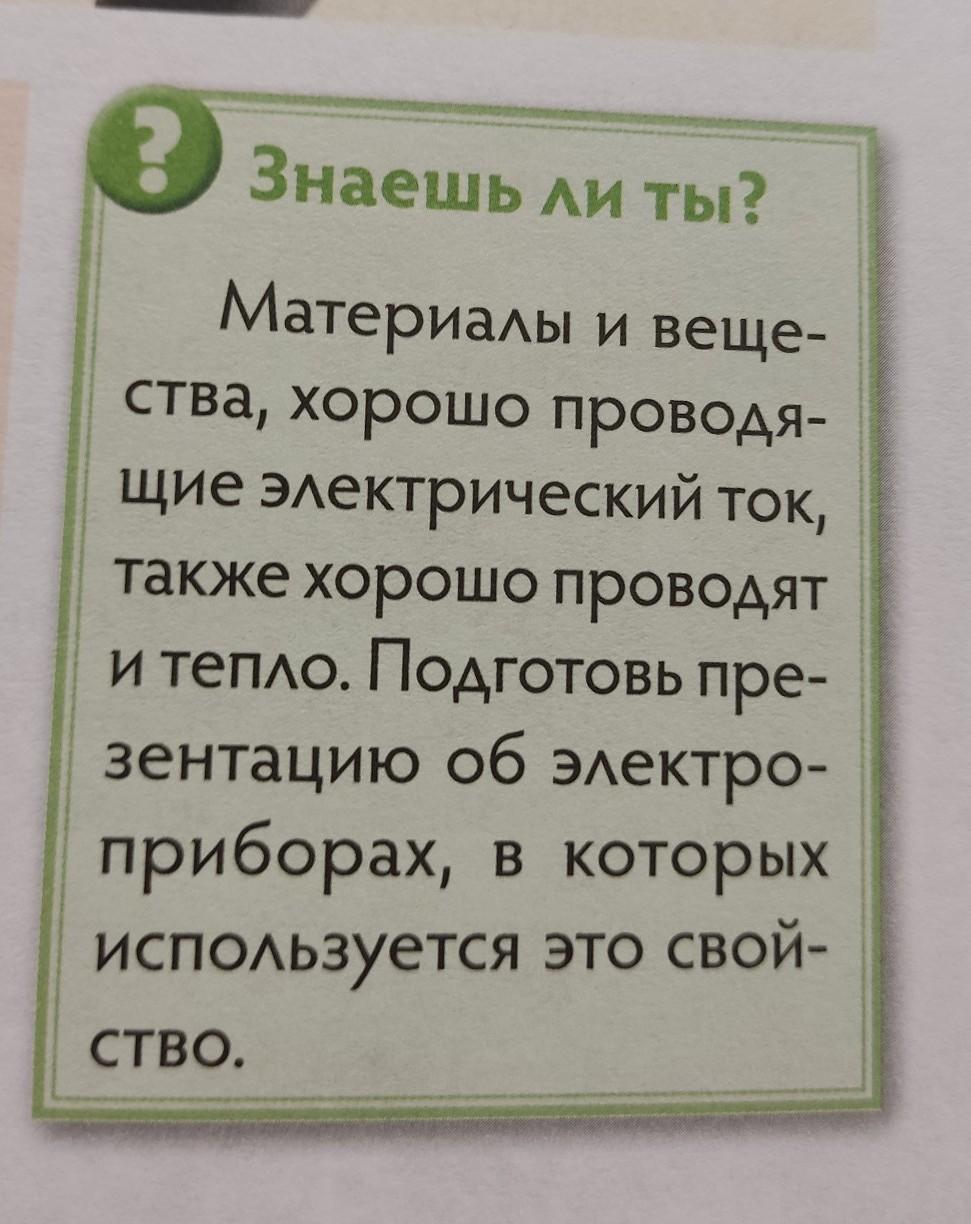 Материалы и вещества, хорошо проводящий электрический ток, также хорошо проводит и тепло. Подготовьте презентацию об электроприборов, в которых используются это свойство.