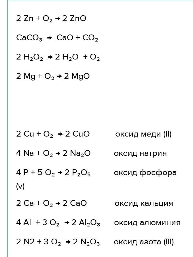 1)_ Zn + O2 - _ZnO 2) CaCO3 - CaO + CO2 3) _H2 O2 - _H2O + O2 4) _Mg + О2 - _MgО