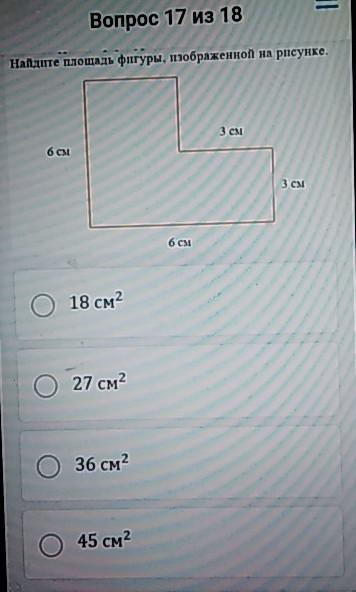 Найдите площадь фигуры, изображенной на рисунке. 6 см О 18 см2 О 27 CM2 О 36 см² О 45 см2 6 см 3 см 3 см
