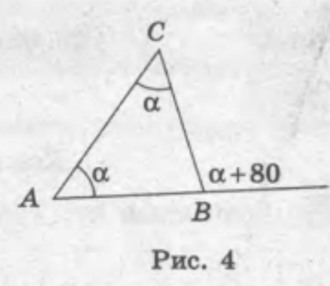 180 -а-а = 180-2а; Також кут АВС є суміжним з кутом а+80 і становить: 180 -(а+80) = 180 - а - 80 = 100 - а. Отже, маємо ріаняння: