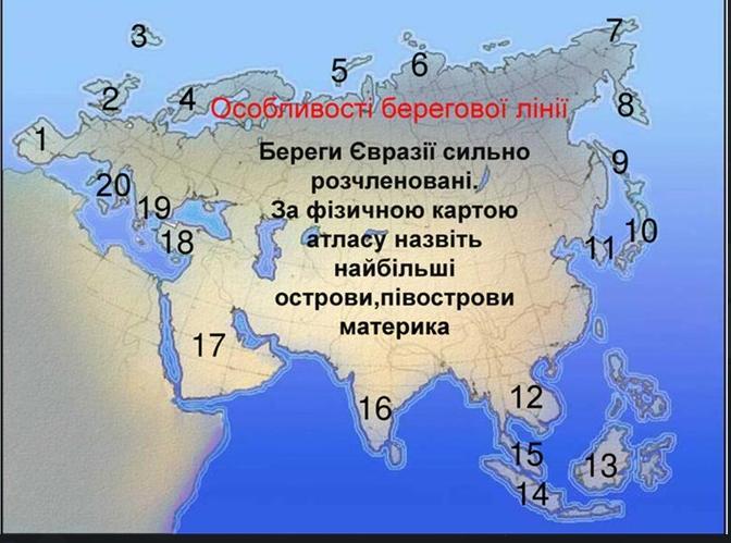 Відповідь: 1 - Пиренейський п-в, 2 - Великая Британия, 3 - Исландия, 4 - Скандинавский п-в, 5 - о-вы Новая Земля, 6 - Таймыр, 7 - Чукотка, 8 - Камчатка, 9- Сахалин, 10 - о-в Хонсю, 11 - Корейский п-в, 12 - Индокитай, 13 - Калимантан (Борнео), 14 - Суматра, 15 - Малайзийский п-в