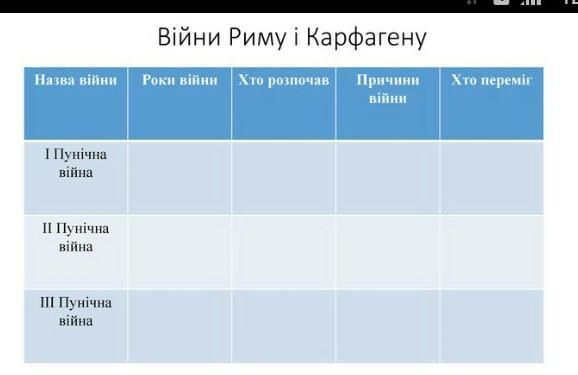 Відповідь:1 війна дата 264 до н. е.– 241 до н. е хто розпочав римляни Приводом послужило втручання карфагенян в боротьбу мамертинців в Мессані проти сиракузького тирана Гієрона II. Перемога Риму
