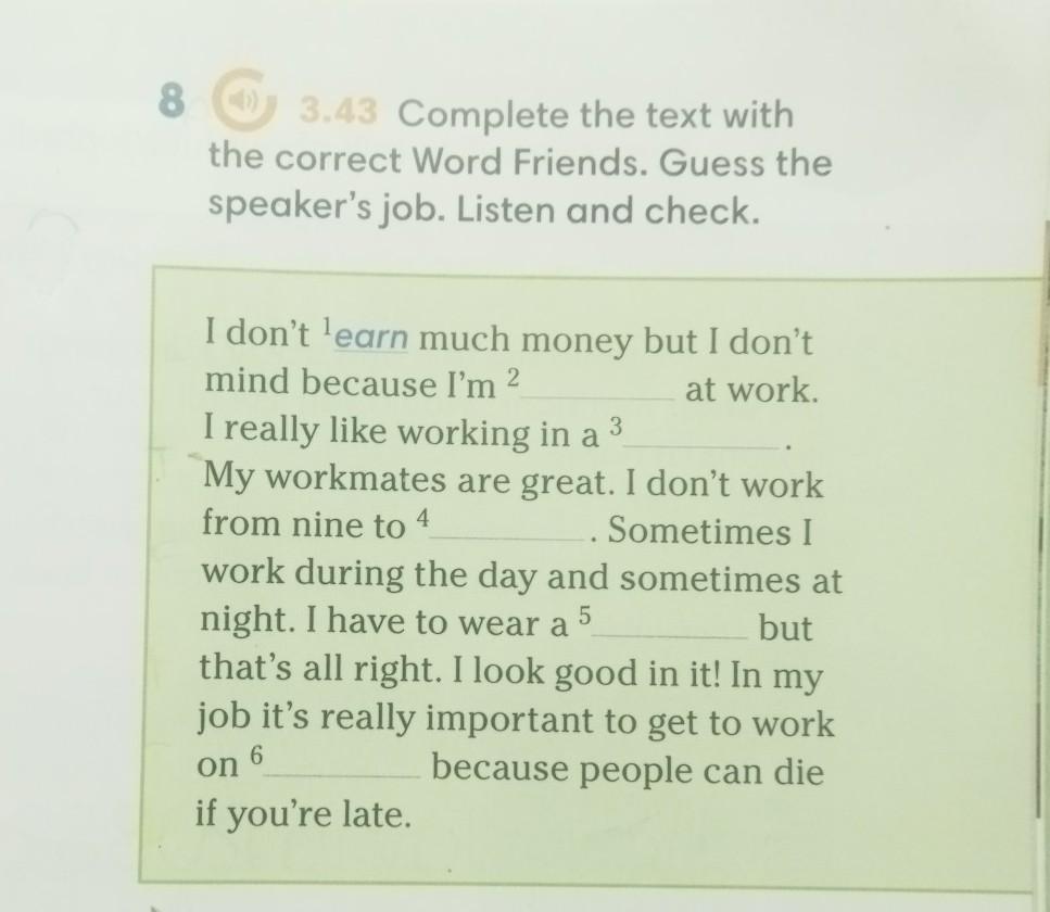I don't learn much money but I don't mind because I'm 2 at work. I really like working in a 3. My workmates are great. I don't work from nine to 4 Sometimes I work during the day and sometimes at night. I have to wear a 5 but that's all right. I look good in it! In my job it's really important to get to work because people can die 6 on if you're late.