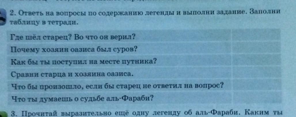 Где шел старец? Во что он верил? Почему хозяин оазиса был суров? Как бы ты поступил на месте путника? Сравни старца и хозяина оазиса. Что бы произошло, если бы старец не ответил на вопрос? Что ты думаешь о судьбе аль-Фараби?