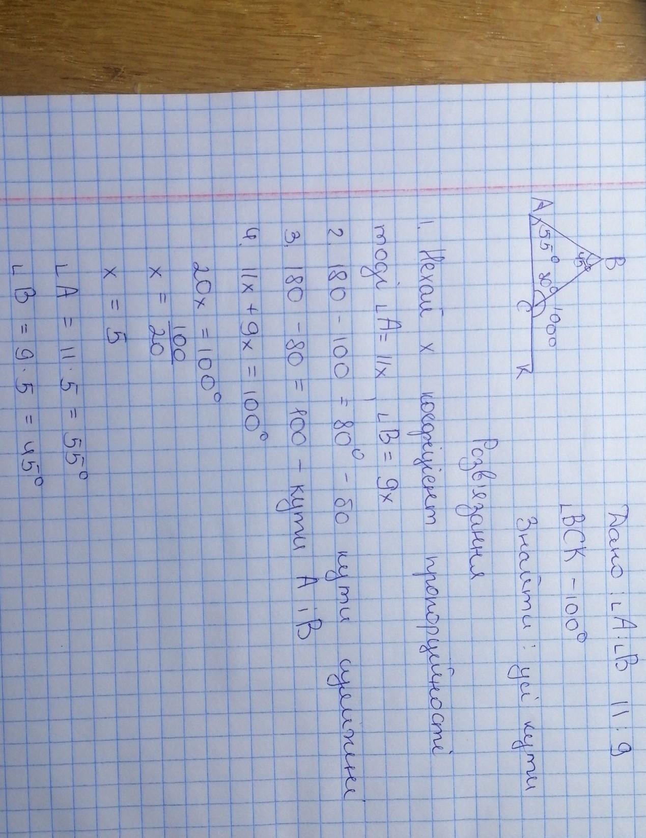 Зовнішній кут трикутника дорівнює 100°, а відношення не суміжних з ним кутів 11:9. Знайди кути трикутника.