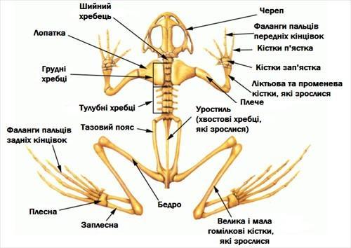 2. Розглянь скелет жаби. Знайди скелет голови (череп ), скелет тулуба (хребет), парні кінцівки та їхні пояси. На які відділи поділяється хребет жаби?