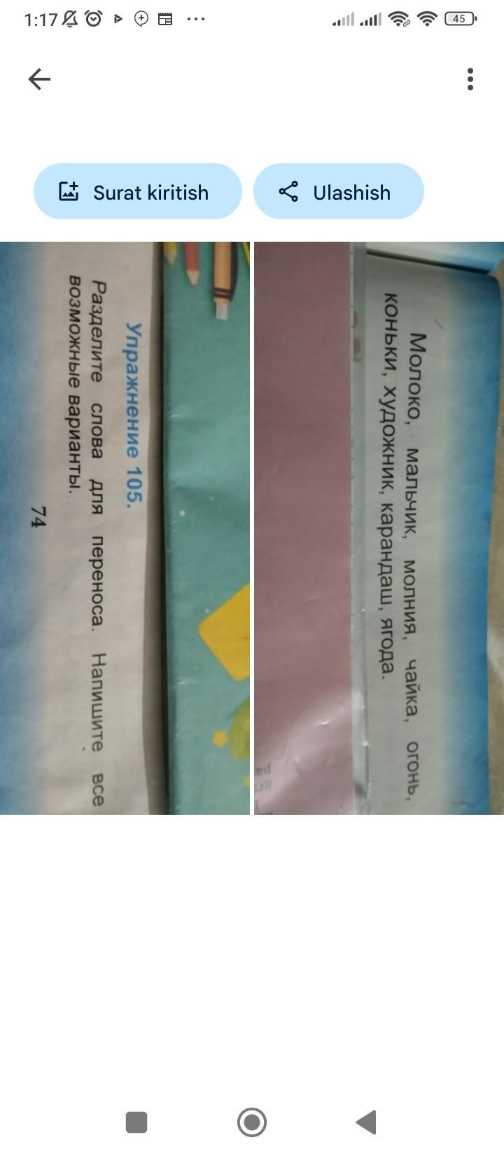 Ответ:Мо-локо,моло-ко;маль-чик;мол-ния;чай-ка;огонь не переносится;конь-ки;ху-дожник,худо-жник;ка-рандаш,каран-даш;яго-да.