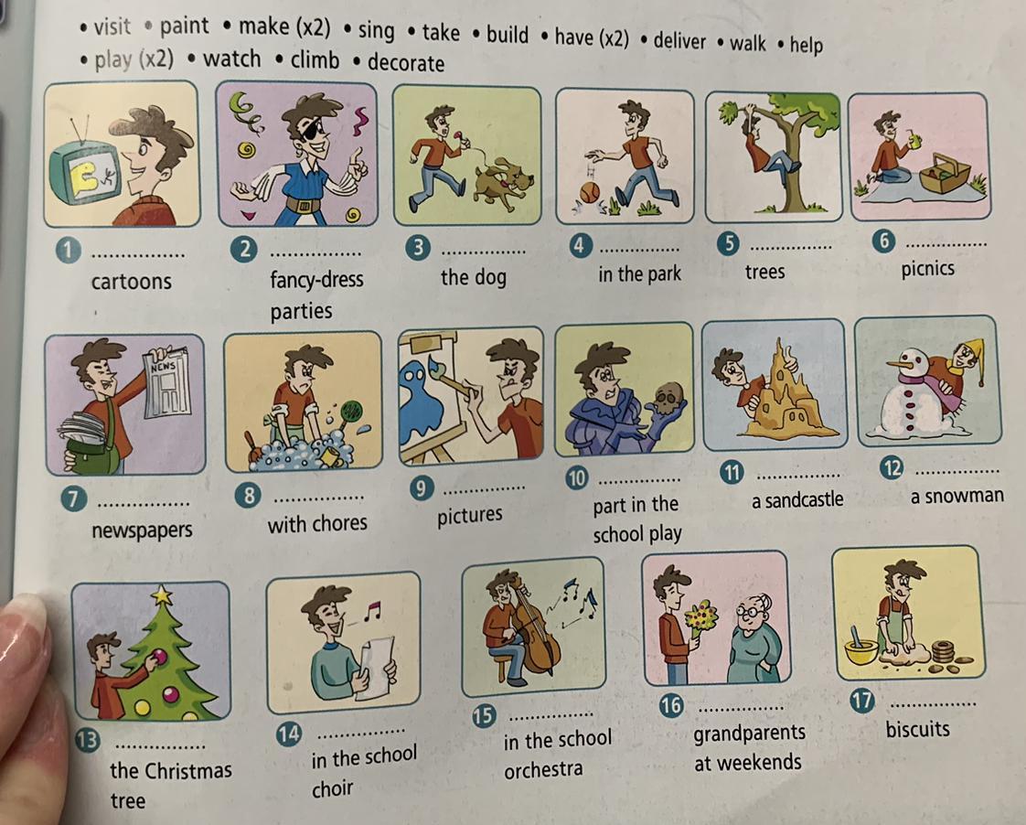 1. watch 2.have 3.walk 4. play 5. climb 6.have 7. 8.help 9.paint 10.take 11.build 12.make 13.becorate 14.sing 15.play 16.visit 17. make