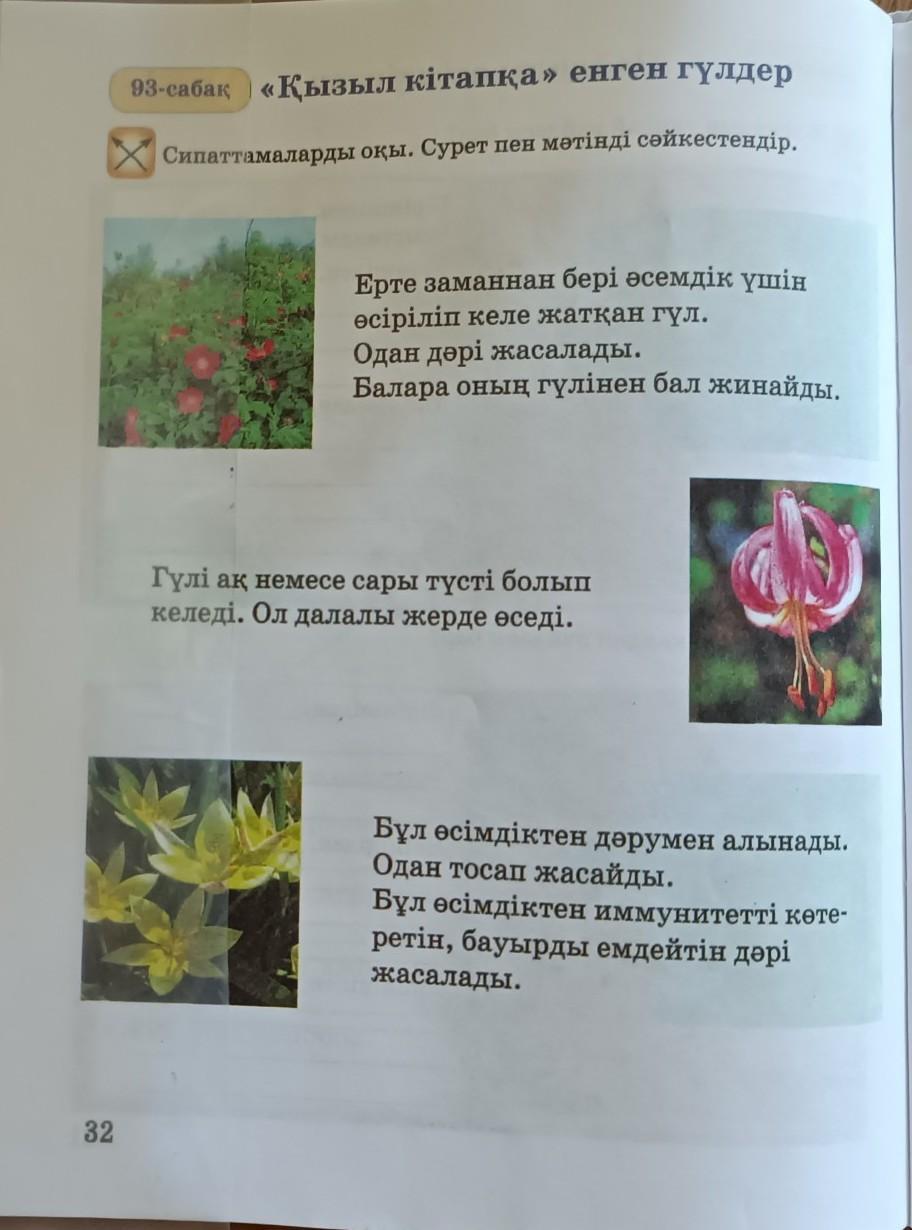 32 93-сабак «Қызыл кітапқа» енген гүлдер Сипаттамаларды окы. Сурет пен мәтінді сәйкестендір. Ерте заманнан бері әсемдік үшін әсіріліп келе жатқан гүл. Одан дәрі жасалады. Балара онын гүлінен бал жинайды. Гүлі ақ немесе сары түсті болып келеді. Ол далалы жерде өседі. Бұл өсімдіктен дәрумен алынады. Одан тосап жасайды. Бұл өсімдіктен иммунитетті көте- ретін, бауырды емдейтін дәрі жасалады.