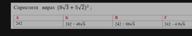 Спростити вираз (8√3 + 5√2)2; A 242 Б 242 +40√6 B 242 +80√6 Г 242-40√6