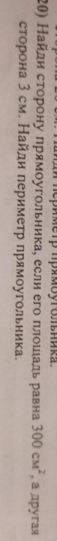 20) Найди сторону прямоугольника, если его площадь равна 300 см², а другая сторона 3 см. Найди периметр прямоугольника.