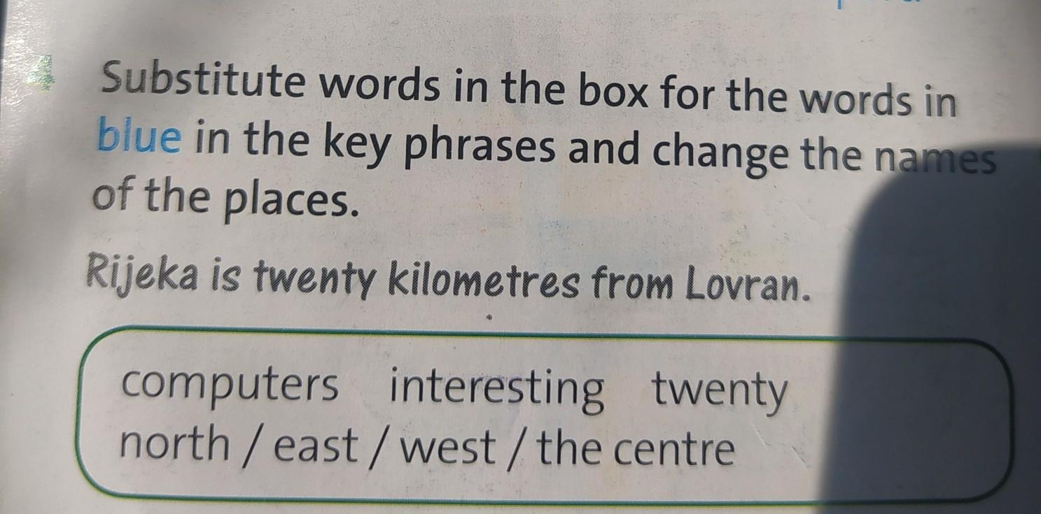4 Substitute words in the box for the words in blue in the key phrases and change the names of the places. Rijeka is twenty kilometres from Lovran. computers north/east interesting twenty / west /the centre помогите пожалуйста я на уроке там надо составить текс из этих слов