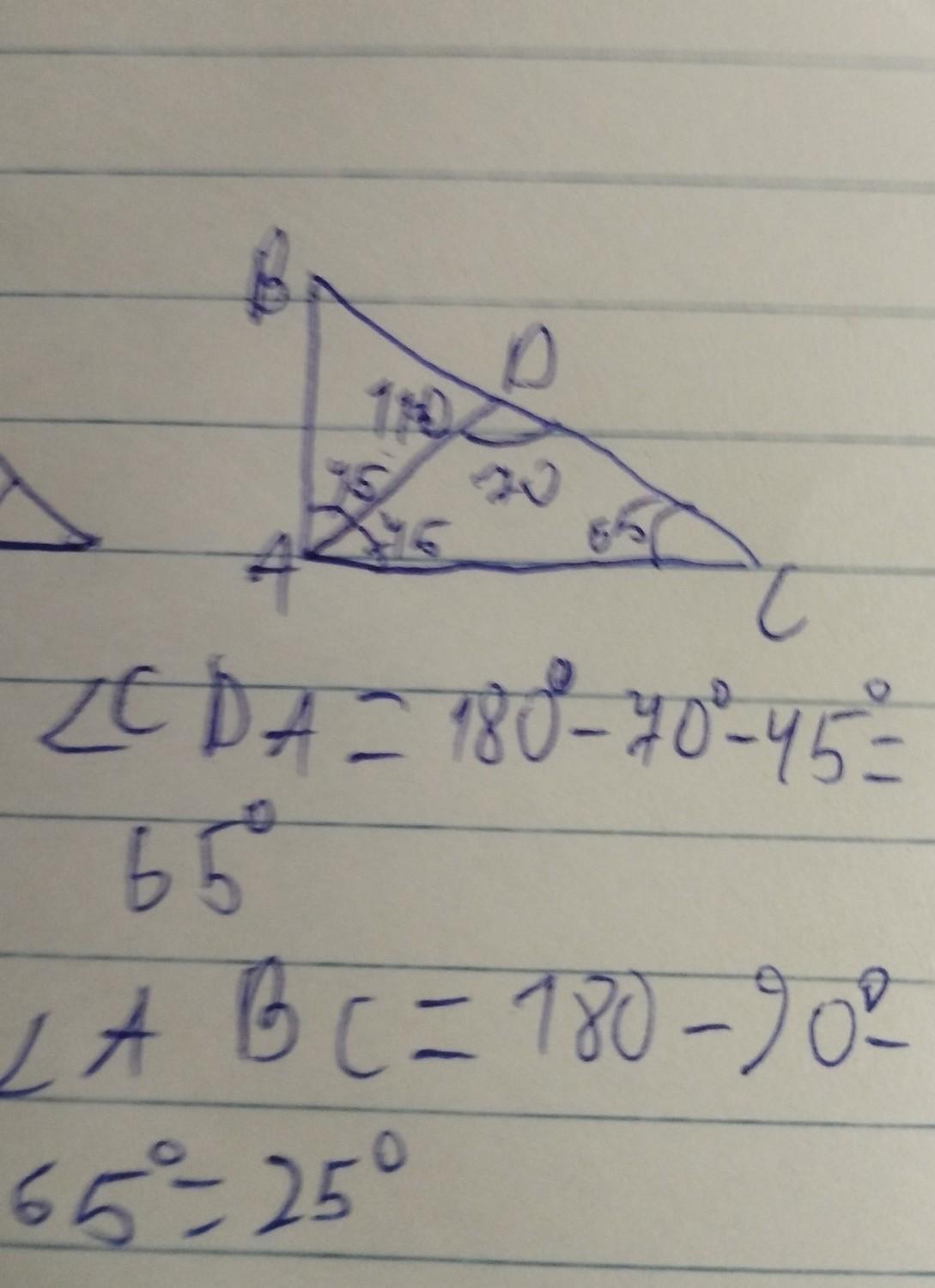 3. Биссектриса прямого угла прямоугольного тре- угольника образует с гипотенузой углы, один из которых равен 70°. Найдите острые углы этого треугольника.