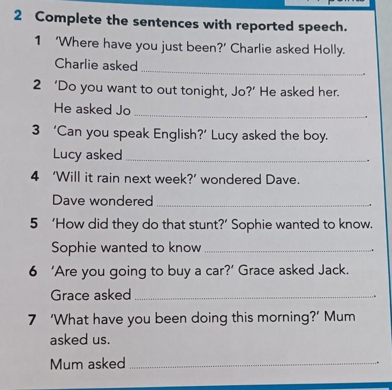 2 Complete the sentences with reported speech. 1 'Where have you just been?' Charlie asked Holly. Charlie asked............. 2 'Do you want to out tonight, Jo?' He asked her. He asked Jo 3 'Can you speak English?' Lucy asked the boy. Lucy aske............... 4 'Will it rain next week?' wondered Dave. Dave wondere.............. 5 'How did they do that stunt?' Sophie wanted to know. Sophie wanted to know 6 'Are you going to buy a car?' Grace asked Jack. Grace asked........... 7 'What have you been doing this morning?' Mum asked us. Mum asked