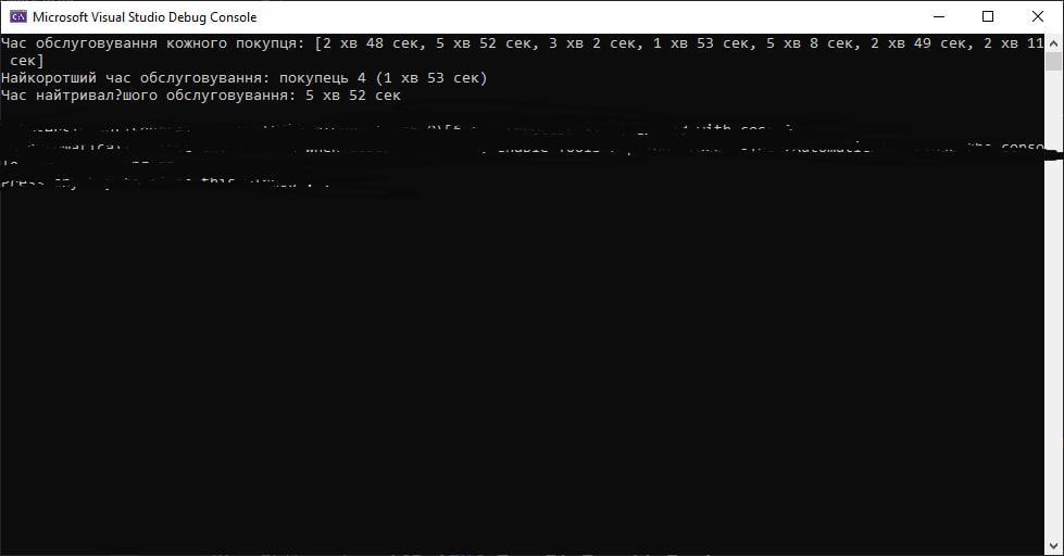 У магазині утворилася черга з 7-ми покупців. Час обслуговування кожного покупця в черзі задати рандомно (у форматі __ хвилин __секунд).