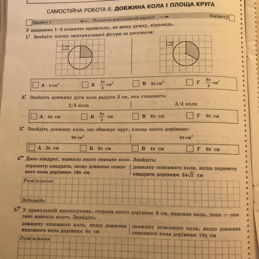 1 . А . π см² . 2 . А . 4π см . 3 . Г . 6π см .