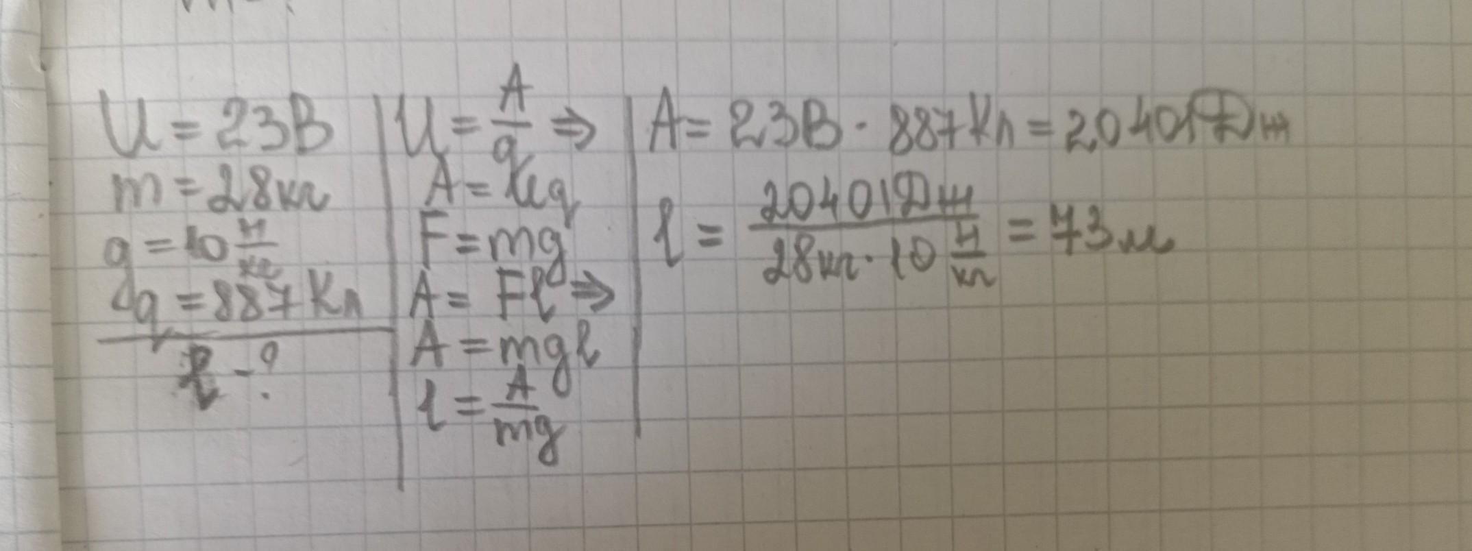Напруга на ділянці кола дорівнює 23 В. З якої висоти має впасти вантаж масою 28кг, щоб сила тяжіння виконала таку саму роботу, яку виконує електричне поле, переміщуючи ділянкою кола заряд 887 Кл?