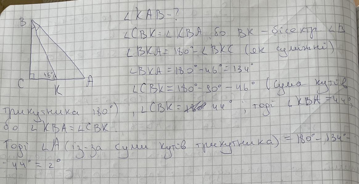 10. Відрізок BK - бісектриса прямокутного трикутника ABC (кут C = 90°). Знайдіть кут КАВ, якщо кут СКВ=46°.