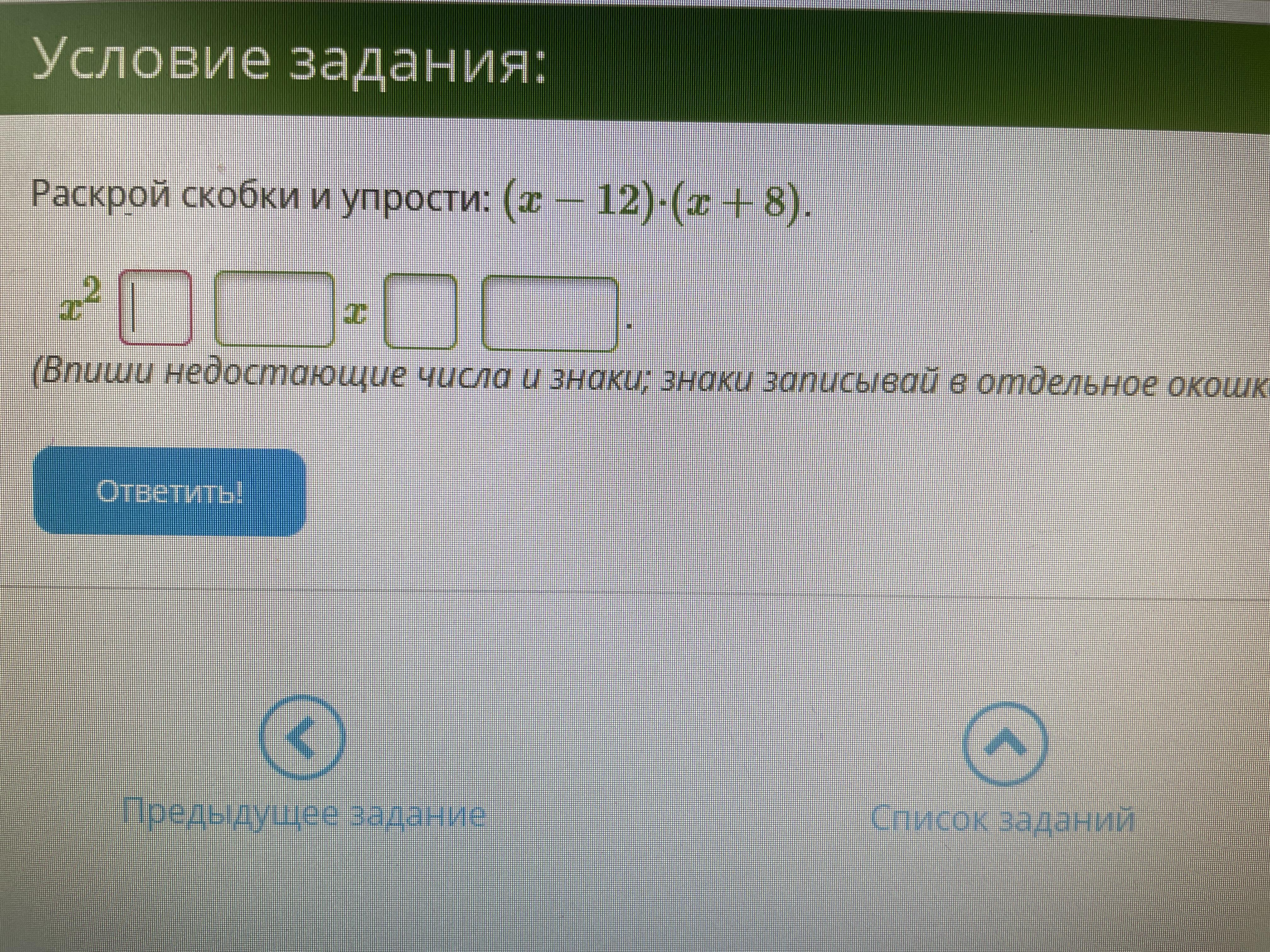 Объяснение: (х - 12)(х + 8) = х² - 8х - 12х - 96 = х² - 4х - 96