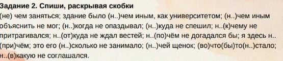 Задание 2. Спиши, раскрывая скобки (не) чем заняться; здание было (н..)чем иным, как университетом; (н..)чем иным объяснить не мог; (н..)когда не опаздывал; (н..)куда не спешил; н..(к)чему не притрагивался; н..(от)куда не ждал вестей; н..(по)чëм не догадался бы; я здесь н.. (при)чём; это его (н..)сколько не занимало; (н..)чей щенок; (во)что(бы)то(н..)стало; н..(в)какую не соглашался.