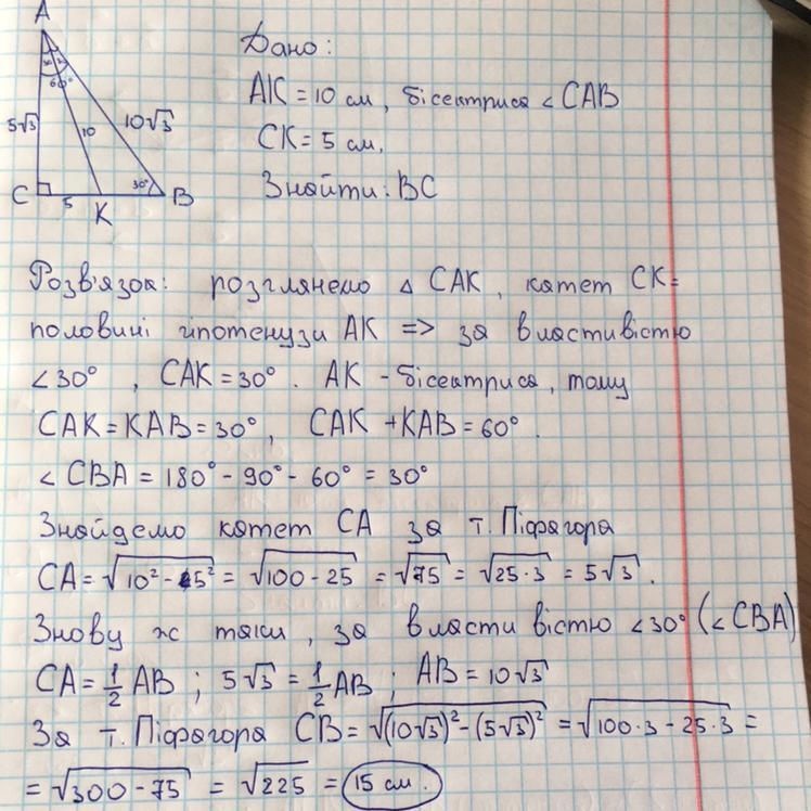 У прямокутному трикутнику ABC (/_C=90°) Проведено бісектрису AK. Відомо що, CK=5 см і AK= 10см. Знайдіть довжину катета BC