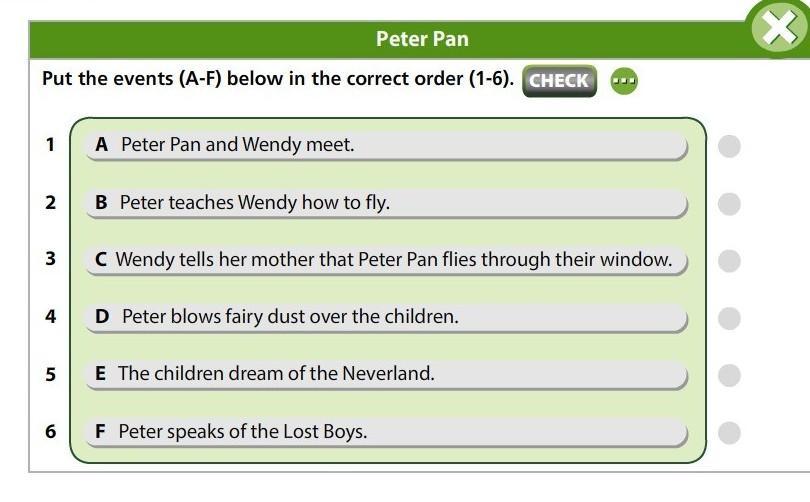 Peter Pan Put the events (A-F) below in the correct order (1-6). CHECK 1 3 4 5 6 A Peter Pan and Wendy meet. B Peter teaches Wendy how to fly. C Wendy tells her mother that Peter Pan flies through their window. D Peter blows fairy dust over the children. E The children dream of the Neverland. F Peter speaks of the Lost Boys.