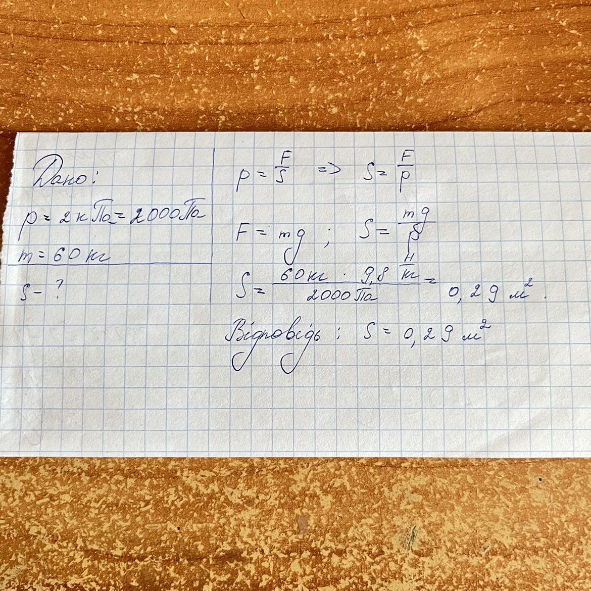 Сніговий покрив витримує тиск 2 кПа. Якої площі опори (одна лижа) лижі потрібно взяти лижнику масою 60 кг на лижну прогулянку, щоб він не провалювався у сніг ? (3 бали)