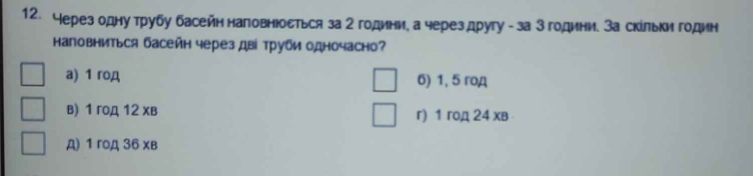 Отже, басейн наповниться за 1 годину 12 хвилин, якщо використовувати обидві труби разом.