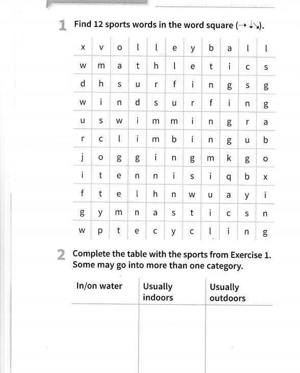 Usually outdoors: volleyball, athletics, wind surfing, climbing, jogging, tennis, cycling, rugby.