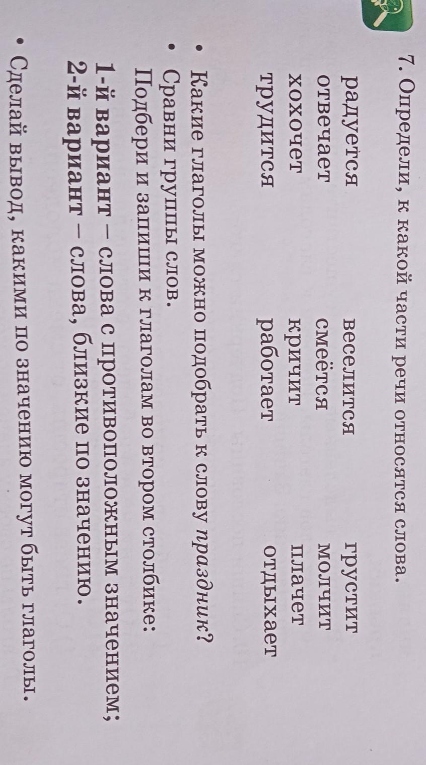 7. Определи, к какой части речи относятся слова. радуется отвечает хохочет трудится веселится смеётся кричит работает - грустит молчит плачет отдыхает • Какие глаголы можно подобрать к слову праздник? Сравни группы слов. Подбери и запиши к глаголам во втором столбике: 1-й вариант слова с противоположным значение 2-й вариант - слова, близкие по значению. -