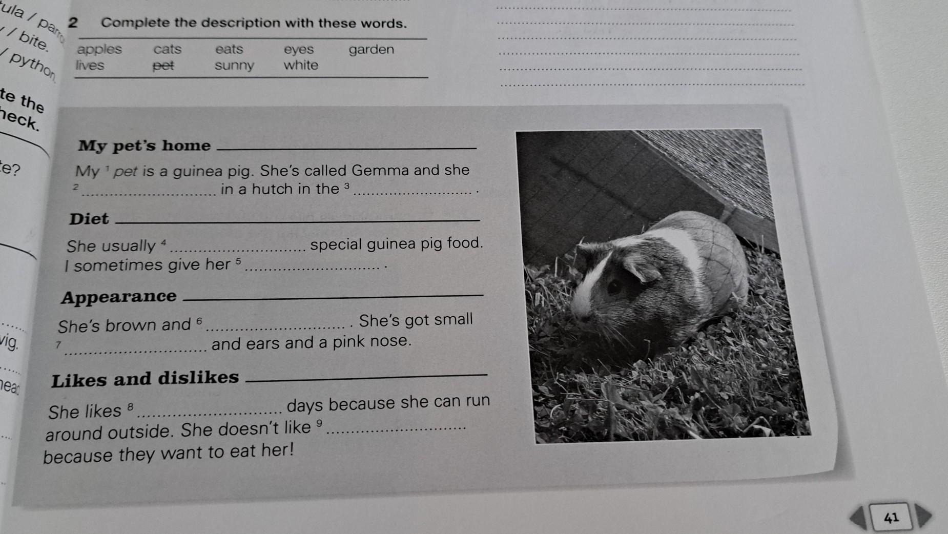 /pa bite. python the ck. 2 7 Complete the description with these words. garden eyes white apples lives cats eats sunny My pet's home My ¹ pet is a guinea pig. She's called Gemma and she 2 in a hutch in the 3 Appearance She's brown and 6 Diet She usually 4 I sometimes give her 5 special guinea pig food. She's got small ... and ears and a pink nose. Likes and dislikes She likes 8 around outside. She doesn't like 9 because they want to eat her! days because she can run Срочно......